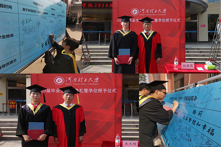 在激昂的加冕进行曲中毕业典礼暨学位授予仪式正式拉开帷幕,全体毕业生依次有序上台受礼,接受学有所成、圆满毕业的“拨穗礼”,该院领导为每一位毕业生进行学位授予仪式合影留念。学院领导和辅导员分别寄语毕业生们坚定理想、执着信念、诚信做人,踏实做事,顽强拼搏,以奋斗之底色,描绘最亮丽的人生画卷。随后,毕业生们纷纷在创意“请假条”毕业生墙上写下名字,表达自己对母校的不舍与留恋。整个学位授予仪式庄严隆重,气氛热烈。毕业生们满怀欣喜与老师、同学、亲友合影留念,向母校、恩师、同窗表达着浓浓眷恋与深切感恩之情。