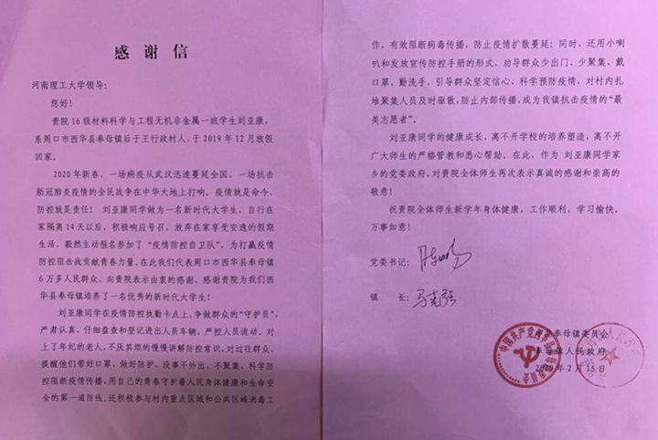 近日,材料学院收到了一封来自周口市西华县奉母镇后于王村的感谢信,感谢该院无机非金属1601班刘亚康同学为该村疫情防控工作所做出的贡献,同时高度赞扬材料学院在立德树人、人才培养方面所作的努力。