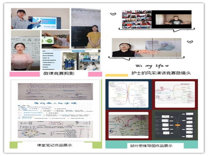 赛项涵盖护理知识竞赛、微课竞赛、思维导图设计竞赛、课堂笔记竞赛及护士风采演讲竞赛五项内容。本次竞赛具有三大特点:一是高效快捷,云上竞赛缩短了空间距离;二是覆盖面广,所有在校的护理、助产专业的本、专科生都可以参与;三是参与度高,本次系列竞赛参加的人数达620人次。在线课堂中教师高质量的线上教学、丰富的授课资源,学生自主探究的学习方式带给参赛选手们扎实的理论功底。社会大事件背景下的海量信息,高速快捷的网络带给参赛选手们无限的资源。护理知识竞赛借助“问卷星”平台,制作竞赛试卷,不仅大大提高了出题以及改卷的工作效率和正确率,也方便更多学生参与,深受同学们的欢迎。微课竞赛中参赛选手使用各种录屏工具、绘图工具、抖音、钉钉、剪映等去甄别、筛选、储存、选择、整合完成作品。部分学生家长也积极参与配合,有的学生还在院子里支起凳子、放上小黑板、伴着公鸡的打鸣声、小鸟的鸣叫录制视频。护士风采演讲比赛中,很多学生选择了形式和内容上的创新,通过将背景音乐、图片与自己的演讲相结合,增强了感染力,更加丰富而生动。在创新之外,还展示了自己过硬的演讲能力,内容有渲染力,结构完整,有自己的思想,演讲表现落落大方,声音娓娓到来,展现了新一代白衣天使的温柔与坚强,体现了对护理工作的认同感和自豪感。课堂笔记是学生学习过程中不可缺少的一项重要内容,课堂笔记竞赛可促使学生养成课堂做笔记的习惯。本次参赛笔记中,出现了许多条理清晰、重点突出、干净整洁,更具有“艺术性”的笔记,有些学生画工了得,通过各种图形将抽象的理论知识形象的表达,让人赏心悦目。思维导图可以锻炼学生的发散性思维和逻辑思维能力,改进学生的学习方法,参赛作品不仅体现了学生们富有逻辑性的思维过程,也锻炼了学生将琐碎的医学基础知识梳理形成知识体系的能力,同时也提升了学生的审美素养。