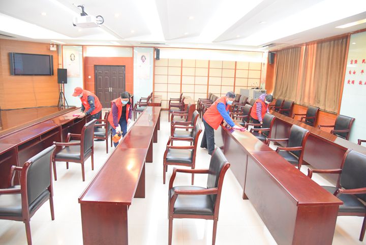 在明德楼一楼会议室,校友办5位工作人员佩戴好防护器具,合理分工,相互配合,认真清理每一处垃圾、仔细擦拭每一张桌子和椅子,对地面、墙面、桌面、椅面等处进行了全面消毒作业,做到了全面扫除不留死角、深度消毒不留隐患,确保会议室干净、整洁、安全。