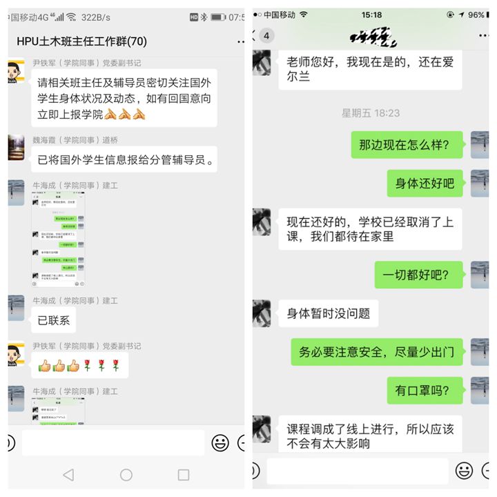 据悉,该院现有9名学生在海外交流学习,其中,1名在德国读预科,8名在爱尔兰参加合作办学项目,目前在海外一切安全。新冠肺炎疫情发生后,土木学院辅导员不忘师者初心、守土有责,一对一联系在海外学习的学生,掌握每一位学生的动态,引导学生服从属地防控管理,加强自我防护,有异常情况及时就医并向学校报告。近日,学院实施海外学生网格化管理,构建9名学生的小单元网格化管理体系,建立工作台账,辅导员、班主任纷纷通过电话、邮件、微信等各种线上渠道,传递新冠肺炎的防控知识和国内抗“疫”的成功经验、有效做法,叮嘱他们认真做好自我防护,以乐观的精神和饱满的斗志战胜目前的困难,学校始终是他们坚强的后盾。学生们纷纷表示感谢学校、学院一直以来对他们的关心和爱护,在这特殊时期一定会保护好自己,学成归来,报效祖国。