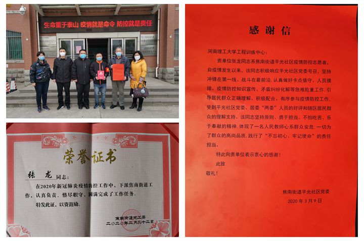 3月9日下午,工程训练中心收到焦南街道平光社区党委的感谢信,感谢工程训练中心教工张龙在2020年新冠肺炎疫情防控工作中所做的辛勤努力与无私奉献。感谢信全文如下: