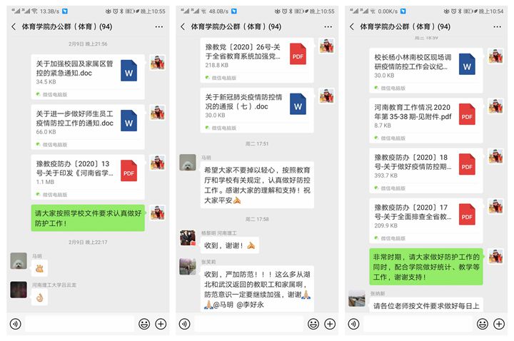 快速反应,及时传达上级防控精神,认真落实防控要求。疫情出现后,学院党委按照学校党委行政的部署,紧急制定了《体育学院新型冠状病毒肺炎防控工作方案》《体育学院防控疫情应急预案》,成立学院新型冠状病毒感染的肺炎防控工作领导小组,明确防控疫情的要求和责任,积极有序开展各项防疫工作。一是及时传达《关于学习贯彻习近平总书记重要讲话精神进一步做好疫情防控工作的通知》(豫办发电〔2020〕10号)和《关于全面排查全省教育系统新型冠状病毒肺炎工作的通知》(豫教疫防办〔2020〕17号)要求,按照学校统一部署,坚持“逐一摸排不留死角”“加强宣传强化意识”“每日统计按时上报”三步走,努力做到传达文件精神及时快速,宣传防疫知识科学到位,上报情况数据真实有效。二是加强宣传力度,通过办公自动化、微信群、QQ群等渠道编发生活提示,普及疫情防控知识和防控要求,使我院师生充分认识疫情的严峻性和复杂性,高度重视防控工作,切实增强紧迫感和责任感。三是严格落实上级防控疫情工作要求,学院第一时间停止运动会、比赛和高水平运动队训练等人员密集活动,坚决杜绝任何形式的聚集性活动,引导师生及家属,疫情防控期间不前往湖北等疫情严重地区及其周边地区进行学习、实践、探亲和旅游等活动,避免与前往湖北等疫情严重地区及其周边地区的人员接触。