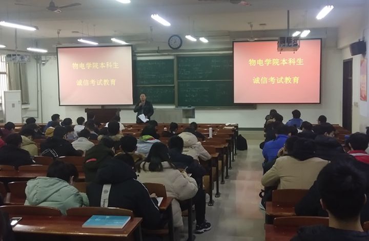 物电学院通过此次主题教育活动的开展,持续推进2019年“学风建设深化年”活动,引导学生树立“既考成绩,更考人格”的观念,鼓励学生努力学习,认真积极备考,严肃考试纪律,拒绝考试作弊,争做诚信考生。