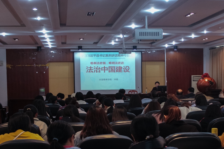 为全面学习贯彻习近平总书记依法治国重要讲话精神,增强师生法治观念,11月19日下午,工商管理学院特邀应急学院副教授申霞在经管楼会议室举办《法治中国建设》专题报告会,该院师生100余人聆听了报告。报告会由该院院党委书记黄定国主持。