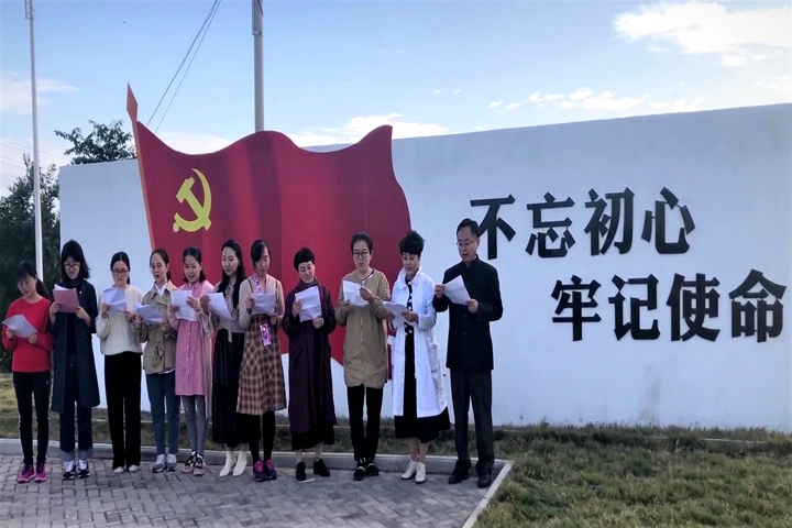 10月8日下午,医学院教工一支部全体党员赴抗日活动根据地焦作市东矾厂村开展了“弘扬革命精神,坚定理想信念”主题党日活动。活动分三个环节:全体党员在党旗下重温入党誓词,追寻入党初心,坚定践行入党誓言;全体党员深情朗诵诗歌《我的祖国》,表达对祖国的热爱及祝福;支部党员参观村中历史遗迹,感受抗战精神,体验新农村变化,以革命精神激励自己不断前行。
