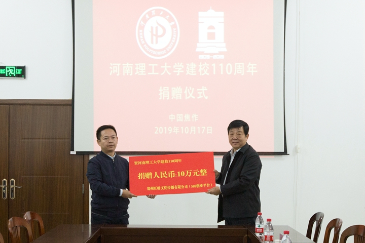仪式上,翟传森代表学校接受郑州旺财文化传播有限公司人民币10万元的捐赠,并为该公司董事长邓文明校友颁发了捐赠证书。