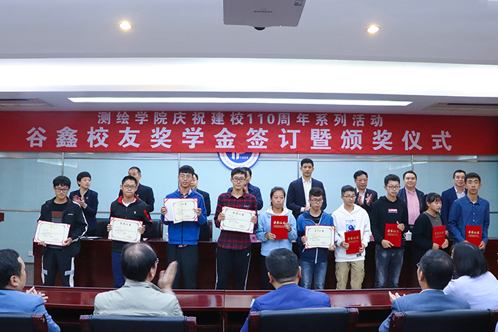 副校长张锟为谷鑫颁发捐赠证书,测绘学院院长魏峰远与谷鑫签订捐赠协议。仪式上宣读了《关于表彰2019年“谷鑫优秀新生奖学金”的决定》,并为吴卉珍等10名获奖学生颁奖。2019级新生苏鹏辉代表获奖学生发言。