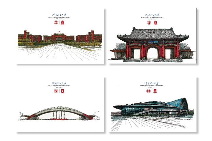 “手绘理工”是一套以我校校园文化为主题而设计的系列文创产品。产品以河南理工大学校园代表性建筑和景观为要素,并对其进行艺术设计加工,创作了一系列包括速写、彩绘、插画等原创美术作品,为产品赋予了艺术性和独特性。