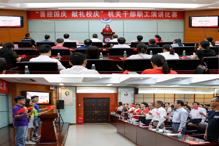 参加比赛的十二名选手精神饱满,感情充沛,他们或娓娓道来、或铿锵激昂,把对祖国、对学校的爱与自豪展现的淋漓尽致。研究生院陈芳杰的《坚定不移走和平与发展的道路》,通过描述祖国令世人惊叹的飞速发展表达了对祖国的赞美和期待;校工会有轶的《祖国,我亲爱的祖国》铿锵有力,充分展现了身为中国人的自豪和对祖国的一片赤诚之心;校团委孔珊的《祝你生日快乐》声情并茂地表达了对祖国和学校华诞的祝福;国教院闪硕的《风景这边独好》通过自身经历,中外对比,展示出了祖国变化之大、国力之盛。参赛选手们富有感染力的演讲打动了评委和在场观众,现场掌声不断。演讲结束,在场人员全体起立,挥动国旗,高唱《我和我的祖国》《河南理工大学校歌》,激昂澎湃的歌声里满是对祖国和学校的无限祝福及身为中国人、身为理工人的无限自豪。