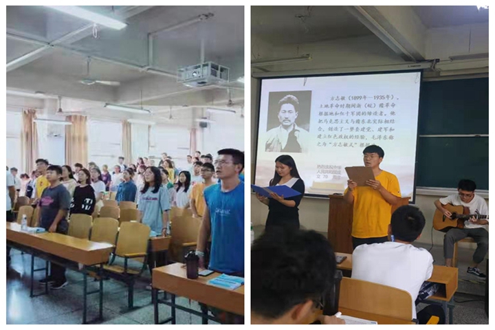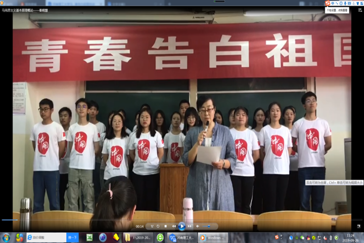 9月26日《中国近现代史纲要》课程王威老师的课堂,来自材料、资环学院的大二学生表演了配乐诗朗诵《可爱的中国》和全体学生大合唱《我和我的祖国》。王老师对学生表演的《可爱的中国》进行了背景介绍。