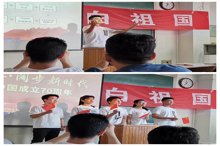 为庆祝中华人民共和国成立70周年,我校马克思主义学院积极响应教育部在千万大学生中开展“青春告白祖国”活动的号召,鼓励思政课教师紧密结合教学内容,指导教师以“讲出来”“演出来”“唱出来”等灵活多样的形式,用青春告白祖国,用奋斗献礼华诞,倾情展现爱国情、报国志、强国梦。