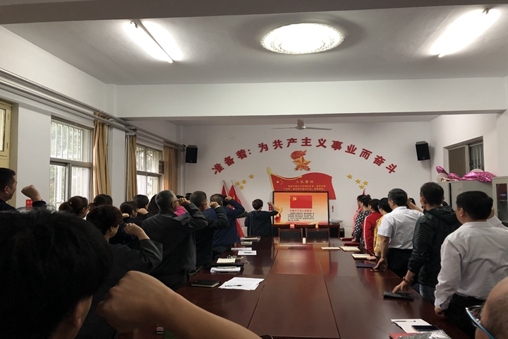 资产全体党员干部在马爱华的带领下面向党旗郑重宣誓,重温入党誓词, 纷纷表示要守住初心,不负使命,立足本职,真正把主题教育成果转化扎实的工作业绩,向建国70周年和学校110华诞献礼,各支部最后进行了支部换届选举。