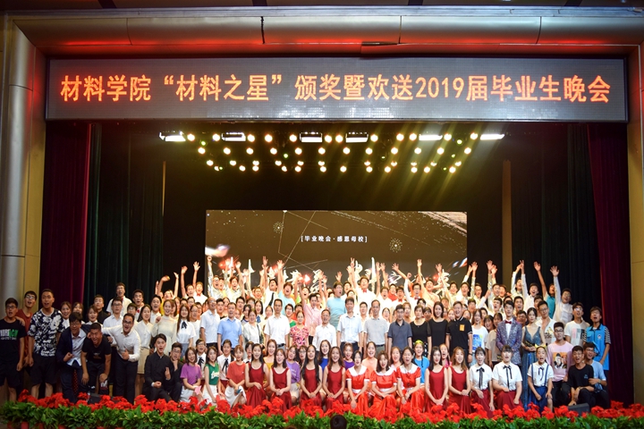 红日隐去,夜幕降临,晚会在一支激情洋溢的开场舞《赞赞新时代》中拉开了帷幕。气势宏大的歌伴武《以歌之名,武动中国》,讲述了中华儿女以其血肉之躯保家卫国的故事。杜泽兵上台致辞,表达了对材料之星获得者的肯定和鼓励,希望获得材料之星的师生继续立足岗位,继续践行学校“好学力行”的校风,他还对毕业生提出了三个希望和建议,希望所有材料学院2019级毕业生要充满信心、坚持学习、持续奋斗。晚会期间进行了“材料之星”颁奖活动,评选出的学生“材料之星”、教师“科研之星”“教学之星”“特别之星”以及“服务之星”等获奖代表一一上台领奖。晚会节目的手语舞描绘最美的《国家》,点燃了大家心中的爱国之情;一篇《材料赋》表达了莘莘学子对学院的热爱,铿锵有力的朗诵中饱含的感情,引起了师生们的共鸣;2015级辅导员和毕业生带来的相声《新闻趣播》和小品《十年》让观众开怀大笑,饱含了浓浓师生情谊。最后,晚会在合唱《强国一代有我在》的歌声中拉下帷幕,现场掌声雷动,学生们纷纷上台合影留念。