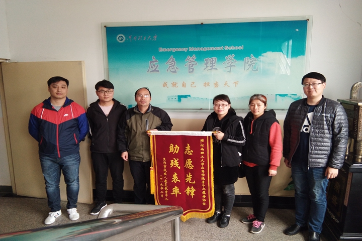 4月2日下午,焦作市残疾人康复教育中心工作人员为应急管理学院团委送来一面书写“志愿先锋,助残表率”的锦旗,表达对应急管理学院团委青年志愿者们在残疾人康复教育中心开展“星火助残,点亮希望之光”和“学·行·践国家安全观公益宣讲”阳光助残志愿项目的感谢,该院党委副书记赵观石代表学院接收赠旗。