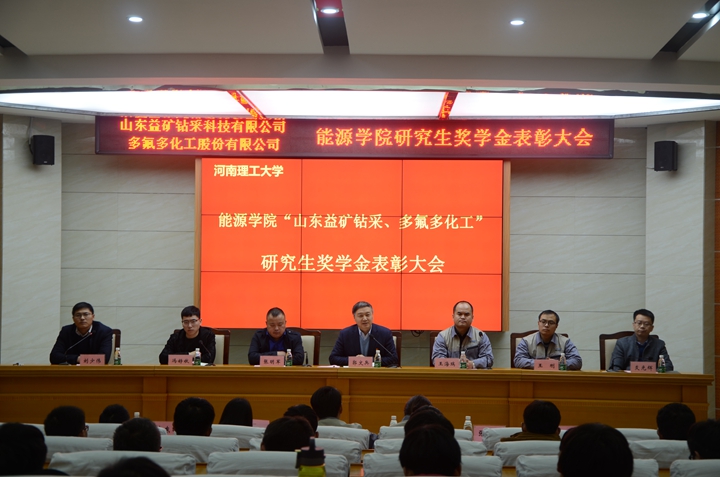 12月25日,能源学院在104学术报告厅举行山东益矿钻采、多氟多化工研究生奖学金表彰大会。山东益矿钻采科技有限公司总经理王海瑞、技术部长王刚,多氟多化工股份有限公司分厂厂长张明军、办公室主任冯好收,能源学院党委书记王婕,院长郭文兵,党委副书记支光辉,副院长李东印、刘少伟参加了会议。会议由刘少伟主持。