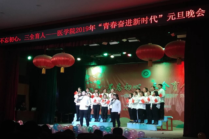 12月25日晚,由医学院主办的“不忘初心,三全育人,青春奋进新时代”主题元旦晚会在我校北校区小礼堂举行。该院党委书记李富梅、党委副书记时洋、院长缪娟、副院长沈军生以及医学院全体学生共同观看了晚会。