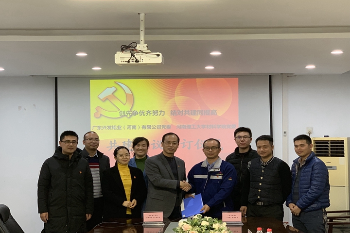 最后,吴锡坤、欧阳文峰代表双方党委共同签署了《广东兴发铝业(河南)有限公司党委与河南理工大学材料科学与工程学院党委党建共建协议书》。协议共建事项包括共同党课、支部结对子、学生实习就业和社会实践、师生科研以及服务企业技术人才培养、合作技术攻关等内容。