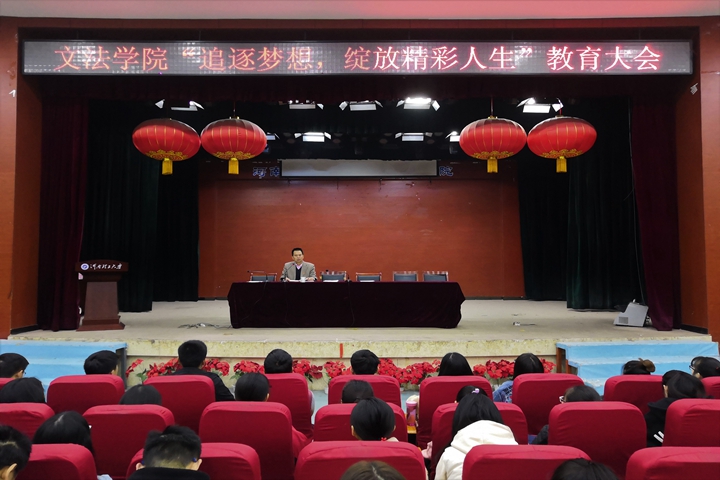 为了进一步推动学院学风建设,帮助学生把握正确的人生方向,文法学院于11月15日下午在北校区小礼堂召开"追逐梦想,绽放精彩人生"教育大会。大会由文法学院党委副书记张建新主讲,该院17、18级全体学生到场聆听。