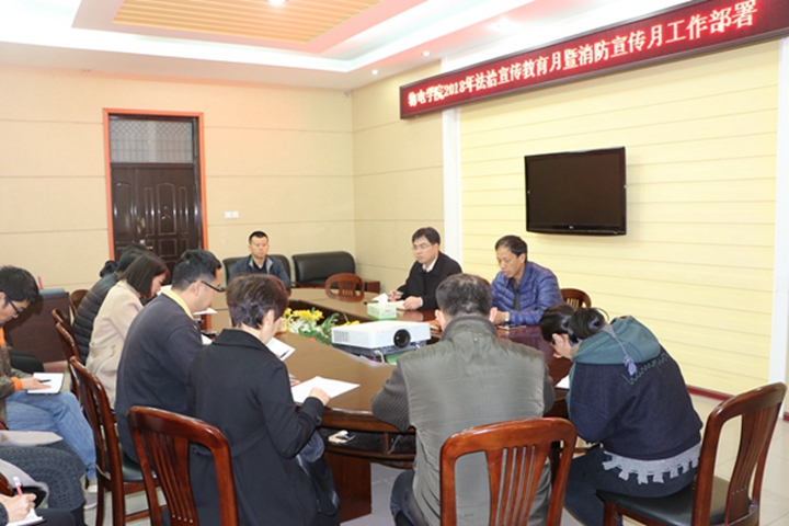 为增强教职工法律意识及消防安全意识,推进学校法治宣传教育和消防安全工作,11月8日下午,物电学院在小会议室召开2018年法治宣传月暨消防安全月工作部署会。该院党委书记余本胜、党委副书记王丙新以及相关负责人参加了会议。