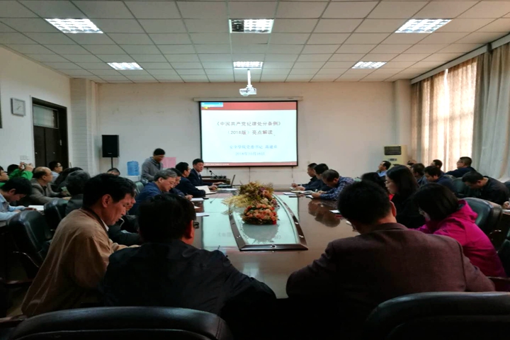 为加强党员干部政治纪律和政治规矩教育,增强党员干部廉洁自律意识,推动全面从严治党向纵深发展。按照校党委、纪委安排部署,进一步贯彻落实《2018年党风党纪教育月活动方案》(校党文〔2018〕89号)通知要求,10月16日下午,安全学院在院楼304会议室举办了党风党纪专题党课——《<中国共产党纪律处分条例(2018版)>亮点解读》,该院党委书记高建良主讲,全体教工党员参加学习。