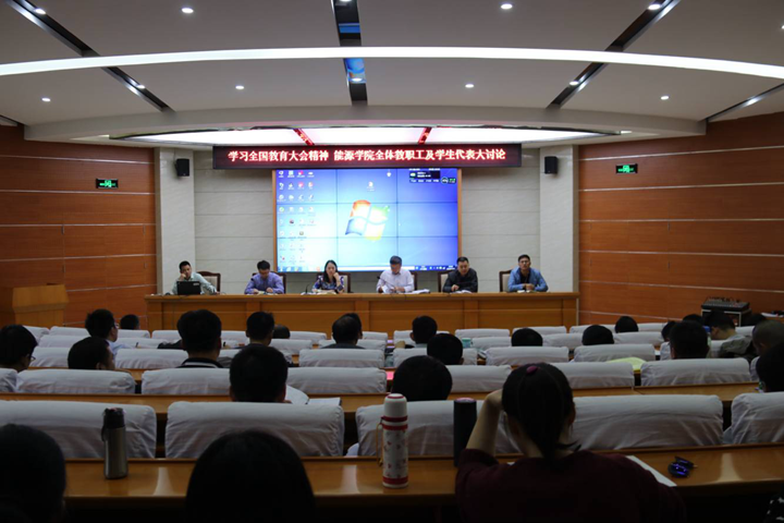 10月9日下午,能源学院在能源楼104学术报告厅举行“学习全国教育大会精神,全体教职工及学生代表教育思想大讨论”活动,该院党委书记王婕,院长郭文兵,党委副书记支光辉,副院长杨玉中、李东印、刘少伟,学院全体教职工及学生代表参加了会议。会议由李东印主持。
