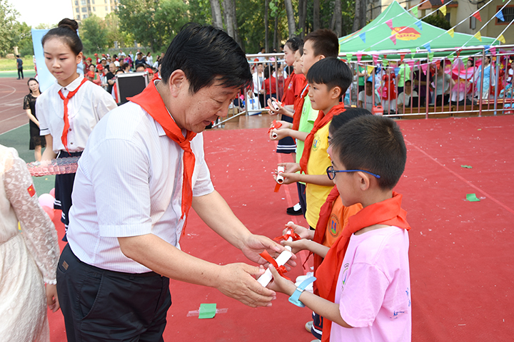 附属小学校长浮红霞为大会致辞,她向小朋友们表达了节日的祝福,向辛勤培育祖国花朵的园丁们和一直以来关心支持小学发展的学校领导以及学生家长表示衷心的感谢。浮红霞在发言中说,过去的一年是忙碌和充实的一年,学校增设了“图书吧”“秀秀吧”等读书、展览区,组织开展了田径运动会、校园足球联赛、画展、古诗词知识竞赛、朗诵大赛、才艺比赛、班级风采展示等丰富多彩的文体活动,取得了河南省“经典照亮人生”诵读比赛集体组二等奖、焦作市“市长杯”校园足球联赛男子和女子甲组二等奖、示范区第二届诗词大会一等奖、焦作市首届创客大赛电脑编程项目一等奖等优异成绩,并荣获焦作市“三八红旗集体”、示范区艺术教育工作先进学校等多项荣誉称号。她希望同学们珍惜童年美好的时光,脚踏实地,拼搏进取,成长为振兴祖国的栋梁之才。