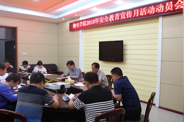 5月11日下午,物电学院在该院小会议室召开2018年“安全教育宣传月”活动动员会。物电学院党委书记余本胜、党委副书记王丙新、各系支部书记、各科室负责人和全体辅导员参加了会议,会议由院党委书记余本胜主持。