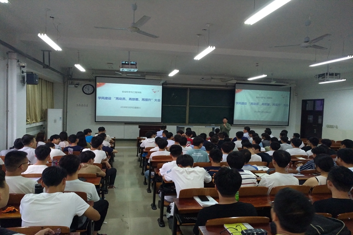 会议伊始,学院学工办负责人首先回顾了安全学院前期学风建设开展情况及存在的问题。李怀珍就安全学院“知学、乐学、勤学、领学、帮学、督学'六位一体'”学风建设体系和“组织结网、骨干发力”机制进行解读,就学生基层组织、学生干部作用的发挥,从课前考勤、课堂领学督学、宿舍长争做学风建设标兵、学生党员1+1精准帮扶等七个方面,就学生党团支部、基层班级、学生会、青协等学生组织,学生党员、基层班级团支部成员、宿舍长如何在学风建设中发挥作用进行了详实部署。高建良作总结发言,并对在场学生干部提出三点要求与希望:一是要从自我做起;二是起好模范带头作用;三是各基层学生组织、学生干部积极在学风建设起推动作用。大会在全体学生干部的学风建设宣誓中结束。