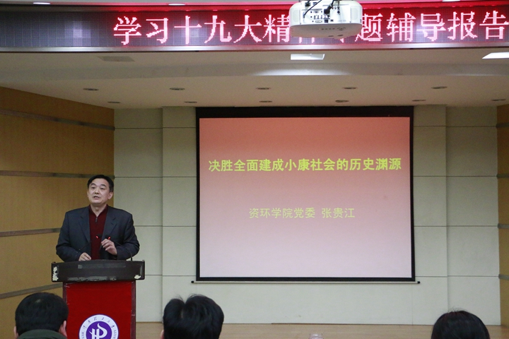 为深入学习宣传贯彻党的十九大精神,扎实推进“两学一做”学习教育常态化制度化,激励教工党员不忘初心,砥砺前行,1月2日下午,资环学院党委书记张贵江以《为决胜全面建成小康社会而努力奋斗》为题,在该院影像厅为全体教工党员上了一堂深刻的党课。