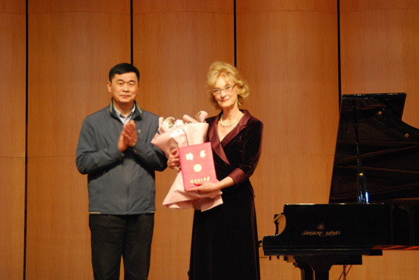 11月30日晚上,我校明德楼音乐厅座无虚席,简·海耶教授钢琴独奏音乐会隆重上演。音乐会开始前,我校副校长赵俊伟为简·海耶颁发了客座教授证书。音乐会上,简·海耶淋漓尽致的展现了其高超的演奏水准。在有限的时间内,简·海耶演绎了莫扎特、沙曼、德彪西、莫雷尔等不同风格的艺术作品,旋律优美动听,时而低回婉约,时而高亢激烈,给予观众身临其境的感觉,全场观众给予了阵阵热烈掌声。
