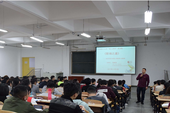 11月7日下午,由学生部(处)主办、材料学院承办的河南理工大学第三十八期“树人讲堂”在材料楼2103教室举行。材料学院97级校友、国家二级人力管理师、河南黄河旋风股份有限公司培训经理李建涛受邀作题为《职场之道——助您实现从校园人到职场人的蜕变》的专题讲座,材料学院300余名学生聆听了此次讲座。