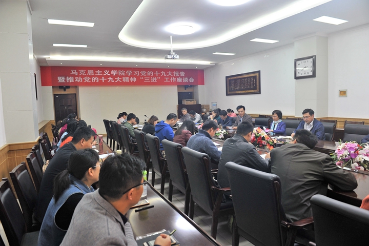 为进一步深入学习领会党的十九大精神,更好更快地让十九大精神“进教材、进课堂、进头脑”,充分发挥好高校思想政治理论课宣传学习十九大精神的主渠道、主阵地作用,10月24日下午,马克思主义学院在文科楼202会议室组织全院教职工召开了“学习党的十九大报告暨推动党的十九大精神‘三进’工作座谈会”,座谈会由该院党委书记李照修主持。