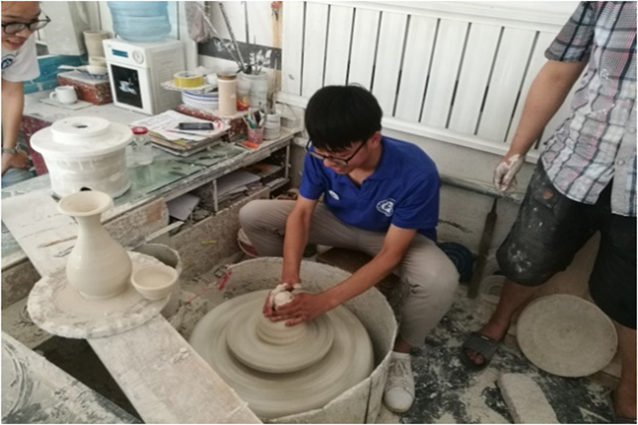 在基地负责人的带领下,实践团近距离观看了绞胎瓷坯胎的制作过程:揉泥、劈花、拉胎、修补,每一道工序都容不得一丝马虎。拉胎可以形成独一无二的自然纹理,而手工劈花需要将不同颜色的泥料进行叠压,反复摔打,切割重组,最后形成羽毛纹、菊花纹等多重纹理。整个制作过程极其繁琐,但工人们有条不紊,极为耐心。在实践团的要求下,工作人员带领队员们亲身体验了绞胎瓷的制作过程。
