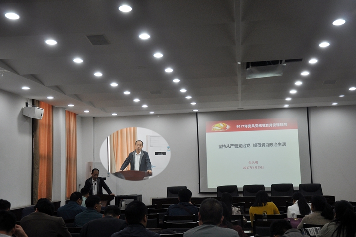 为扎实开展2017年党风党纪教育月活动,深入贯彻落实党的十八届六中全会精神,进一步加强“二准则四条例”的学习教育,4月25日下午,土木学院举办了《坚持从严管党治党,规范党内政治生活》专题党课。党课由该院党委书记朱天明主讲,学院全体教工党员参加了此次党课。