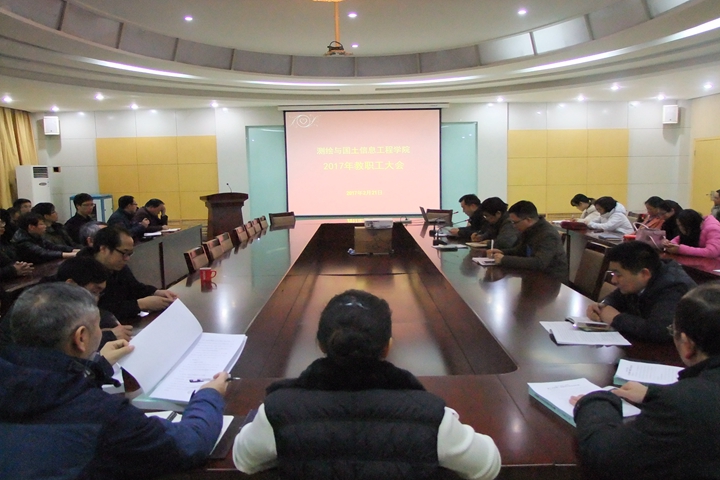 2月21日下午,测绘学院在该院一楼会议室召开新学期工作会议,传达学校2017年上半年工作会议精神并部署学院新学期重点工作,该院全体教职工参加会议。会议由该院党委书记郭增长主持。