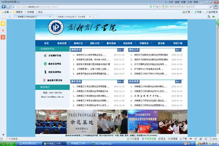 该网站是我校开展创新创业教育的重要阵地,是全校师生员工、海内外校友和社会各界人士了解我校创新创业教育和发展成就的平台,是展示我校大学生创新创业能力和精神风貌的窗口。设有“机构设置”“新闻公告”“团队介绍”“导师风采”“服务指南”“创业政策”“留言板”“文件下载”“相关平台”等一系列贴近大学生创新创业教育活动的栏目和图片。该网站具有“信息量大、功能完备、栏目丰富、重点突出”等特点。
