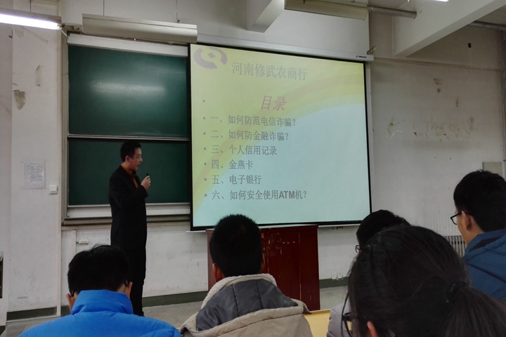 讲座伊始,该院学工办主任何军向到场的师生通报了近期校园不良网络借贷诈骗案件,并向师生介绍来自农商行的相关领导。许言向师生们详细介绍了什么是电信诈骗及其特点,并引用大量数据向师生们说明当今社会诈骗形式的严峻。他详细阐述了什么是金融诈骗,将金融诈骗与电信诈骗作以鲜明的区分。当谈到如何防范电信诈骗和金融诈骗时,许言列举了许多发生在师生身边的典型案例,并告诫大家要防止类似情况发生在自己身上。最后,他就个人信用记录、金燕卡和电子银行等业务向师生们作了说明,介绍如何安全使用ATM机,让大家对银行服务有了一个初步、明确、系统的认识。讲座结束之际,何军对本次讲座作简要总结。