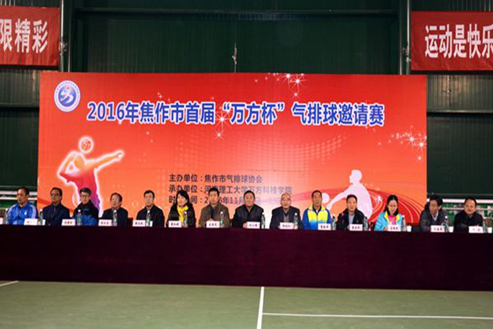11月18日下午,由焦作市气排球协会主办,河南理工大学万方科技学院承办的焦作市首届“万方杯”气排球邀请赛在万方科技学院体育馆开幕。