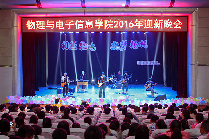 10月18日晚,物理与电子信息学院2016年“相遇物电,执梦扬帆”迎新晚会在南校区小礼堂举办。该院党委书记余本胜、院长张长森、学生处副处长孙彦、党委副书记王丙新,副院长李宝华、王新、李明及全校800余名师生共同观看了此次晚会。