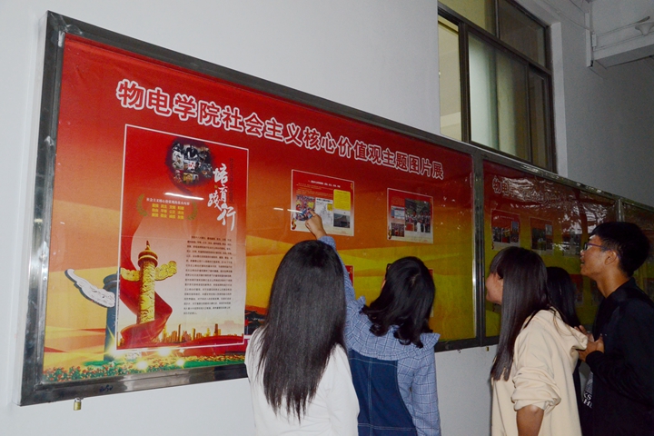 为更好地践行社会主义核心价值观,物电学院近日在学院二楼宣传橱窗举办了一期以“培育和践行社会主义核心价值观”为主题的图片展,吸引了广大师生驻足观看。