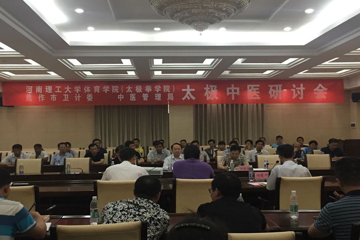 6月17日下午,体育(太极拳)学院在学校力行楼方形会议室与焦作市卫生计生委、中医药管理局举行了太极中医研讨会。焦作市卫生局副局长孔祥群、中医药管理局局长何银堂,我校社会科学处处长程伟,体育(太极拳)学院党委书记张纳新、副院长杨黎明及该院相关教师和中医药管理局70余人参加会议。会议由杨黎明主持。