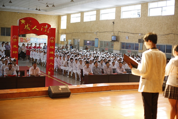 副校长翟传森,焦作市文明办副主任王保杰,医学中专部全体班子成员,以及全体班主任共同见证了这一庄严的时刻。仪式分为国旗手出旗、奏国歌、全体行注目礼;文艺演出;两代人的对话;迈成人门、颁发成人手册;护理专业授帽传光;全体同学医学生宣誓。
