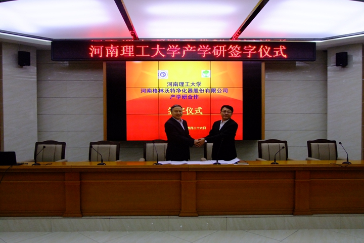最后,郭文兵与行朝共同签署了“河南理工大学能源学院与河南省格林沃特净化器股份有限公司产学研合作”协议。