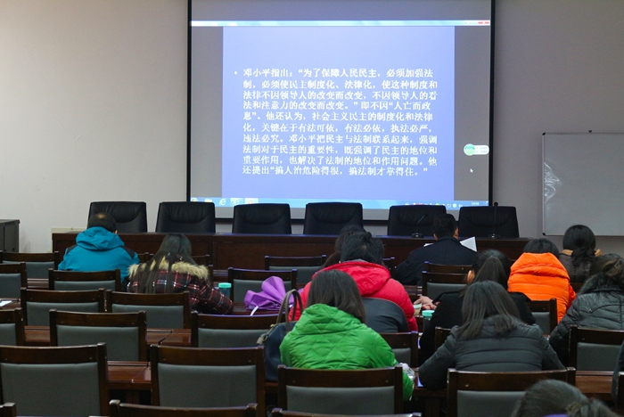11月24日下午,土木学院全体师生党员分别在学院一楼报告厅和201、202教室观看中央党校政法教研部主任李良栋主讲的《全面推进依法治国专题讲座》教育片。