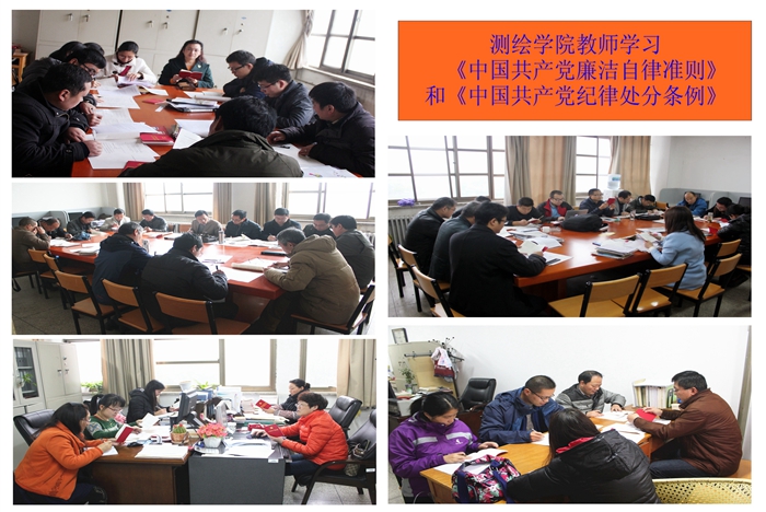 为深入学习贯彻党的十八届五中全会精神,深化中央从严治党实践成果,落实省委全面推进依法治省以及学校开展法制教育宣传月要求,增强党员教职工廉洁自律意识,11月17日下午,测绘学院组织了《中国共产党廉洁自律准则》和《中国共产党纪律处分条例》专题学习会议,会议以系(室)为单位进行,各教工党支部书记主持会议。