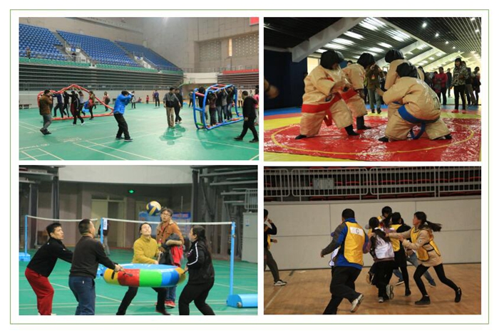 运动会比赛项目包含“鼠袋运球”“超级相扑”“众星捧月”“财源滚滚”和“撕名牌大战”等5个趣味活动。教职工和学生自由组合,组建了“颜值爆表队”“资产爆表队”“偶像队”“国际队”等4支队伍。比赛中,队员们密切配合,奋力拼搏,力争上游,现场气氛热烈。