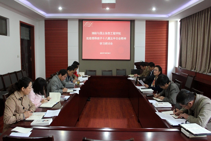 10月30日上午,测绘学院在二楼会议室召开专题学习会议,集体学习了党的十八届五中全会精神。会议由该院党委书记王晓梅主持,领导班子成员和全体科级干部参加会议。