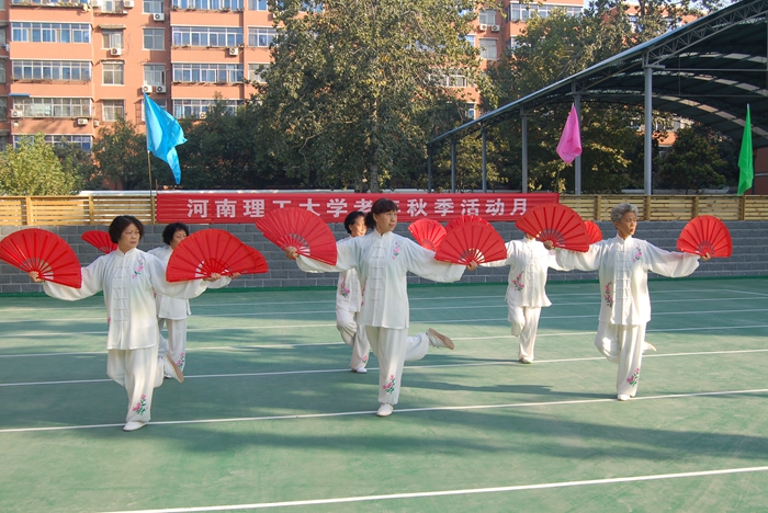 离退休工作处处长张世锋致开幕辞。他代表离退休工作处向光临开幕仪式的老同志们表示欢迎。他表示,今年离退休工作处很好地落实了党的群众路线教育实践活动各项整改措施,加大了基础设施投入,使老同志活动场所环境有了长足进步,并整修了门球场、多功能活动场等基础设施;新校区活动中心也投入使用,使活动场所更加趋于合理。张世锋强调要以“三严三实”教育活动此为契机,查找工作不足,强化人员责任、服务意识,改进工作方法,提高效率,服务好各位老同志,使老同志们满意,同时希望老同志们在此次活动月中积极参与,增强体育锻炼意识,提高身体素质,增进交流,促进健康。周志远宣布河南理工大学离退休教职工秋季活动月正式开幕。开幕式临近结束时,养生太极协会的老同志们表演了太极拳、太极扇,太极单刀等节目。精彩的表演得到了阵阵掌声。