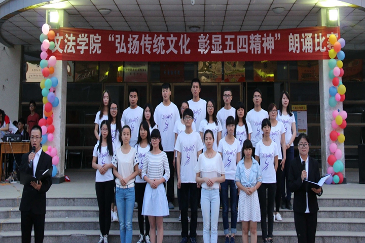 为培养学生综合素质和团队合作精神,扩大学生参与第二课堂活动的覆盖面,同时弘扬中国优秀传统文化,提升学生爱党、爱国和爱校热情,5月17日,文法学院在文综楼举办了“弘扬传统文化,彰显五四精神”班级合诵比赛。大赛面向该院全体13、14级学生。